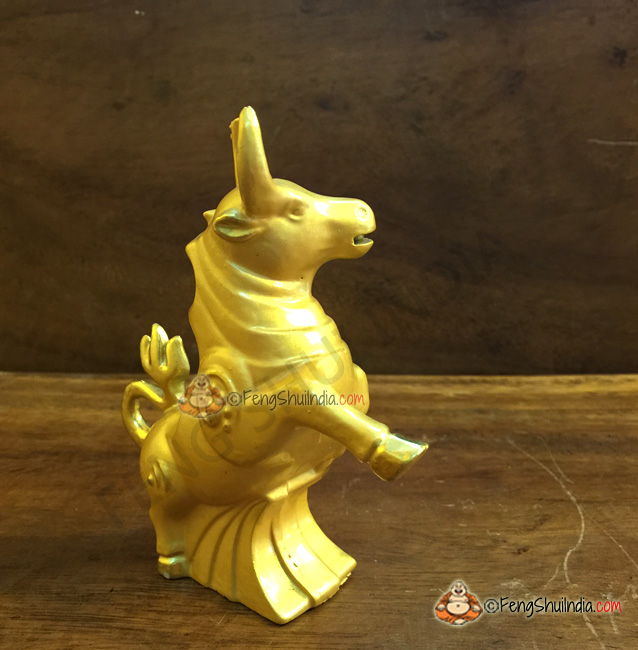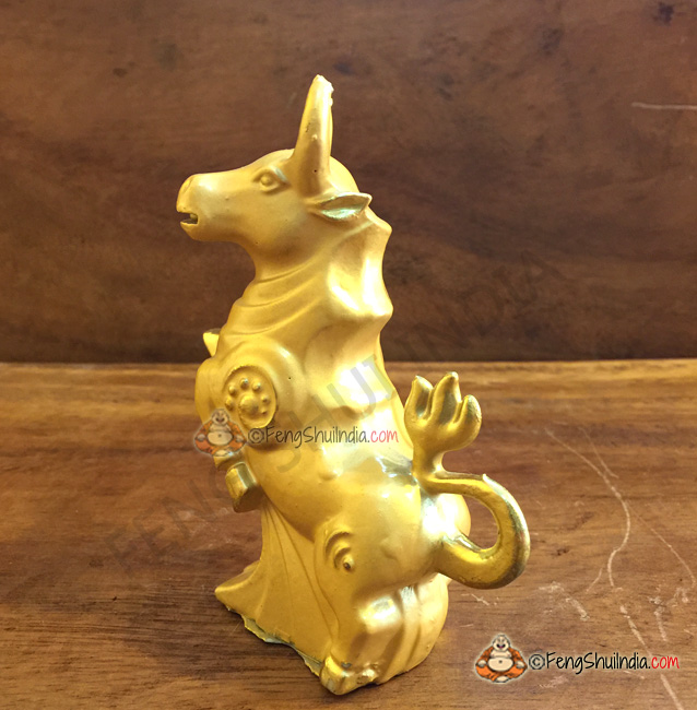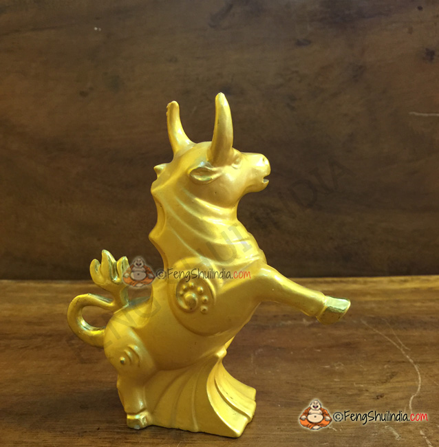 A magnificent figurine of a Feng Shui Bull for Speculative Luck also known as Feng Shui Ox, muscular, confident and strong. Shown with two prominent horns with its head held high, this sculpture is a symbol of aggressive financial optimism and prosperity, and spectacular economic boom. This enhancer is especially favored in times of recession and financial crisis. Perfect to be displayed on your work desk.